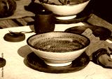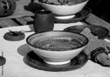 Rustic table setting outside in garden with empty craft ceramic tableware