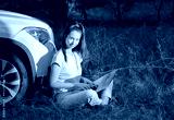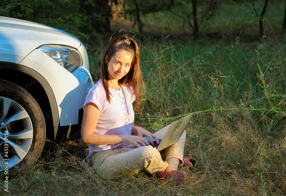 A young woman, girl with brown hair is sitting on a clearing with green grass in a wood, green forest, working at laptop. Remote work, study. Student near a car with a notebook in nature. Copy space.