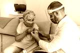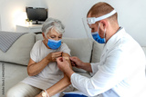 Proud senior woman who had just been vaccinated portrait. A male doctor attends to the needs of her senior male Caucasian patient. He gives her an injection and placing adhesive bandage. Vaccination.