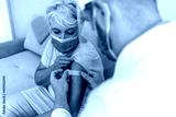 Proud senior woman who had just been vaccinated portrait. A male doctor attends to the needs of her senior male Caucasian patient. He gives her an injection and placing adhesive bandage. Vaccination.