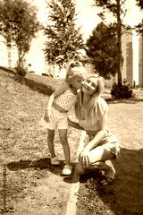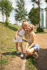 young beautiful mom with her daughter in the summer yard