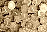 coins with a face value of 10 rubles on a wooden table, Russian rubles close up background