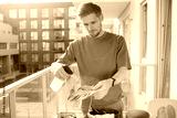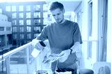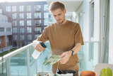 Man gardeners transplanting monstera plant in pot. Concept of urban home garden. Good life and daily relaxation. Happy green life. Male hobby and summer lifestyle outdoors. Watering plants for energy