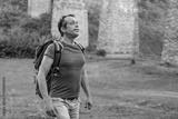 An elderly man of 45-50 years with a tourist backpack on his back goes to the viaduct. Concept: travel and adventures in retirement, active recreation in the mountains, interesting places.