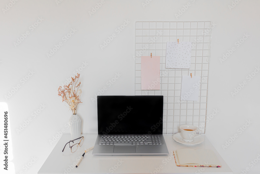 Aesthetic minimalist home office desk workspace on white background. Business, work concept for blog, website, social media.