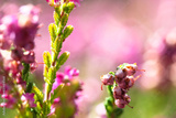 Beautiful blooming pink heather in a forest clearing at sunny day. Small lilac purple flowers on long stems. Flowering, gardening. Calluna vulgaris on green blurry background. Flower store concept.