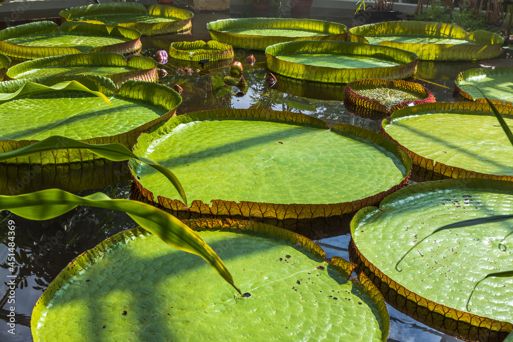 Beautiful view of Victoria Cruziana Santa Cruz water lily tropical flower. Sweden.