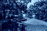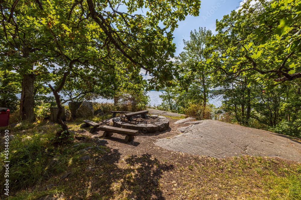 Beautiful view of outdoor grilling picnic place on green trees background. Sweden.