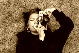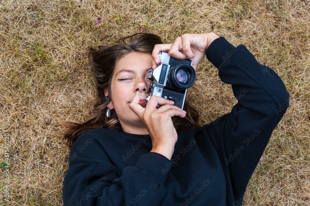 Cute teen girl with a camera, a girl taking pictures on a retro vintage camera on the grass in the park, a hobby concept