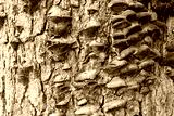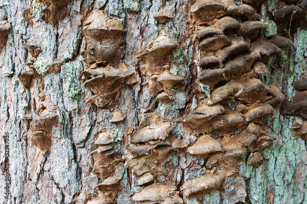 A colony of brown mushrooms grows on an old tree in the forest, mushrooms grow on the bark of the tree, close-up