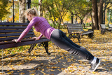 Young woman does push-up exercises in the park. Sports outside in autumn