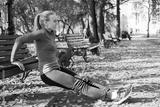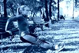 Young woman does push-up exercises in the park. Sports outside in autumn