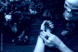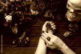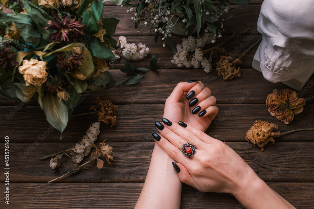 Female hands with black manicure and vintage ruby ring. Withered flowers and a skull. Romantic gothic concept.