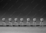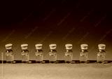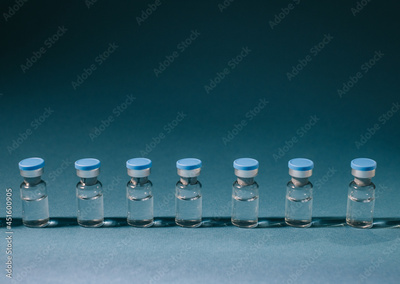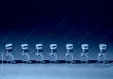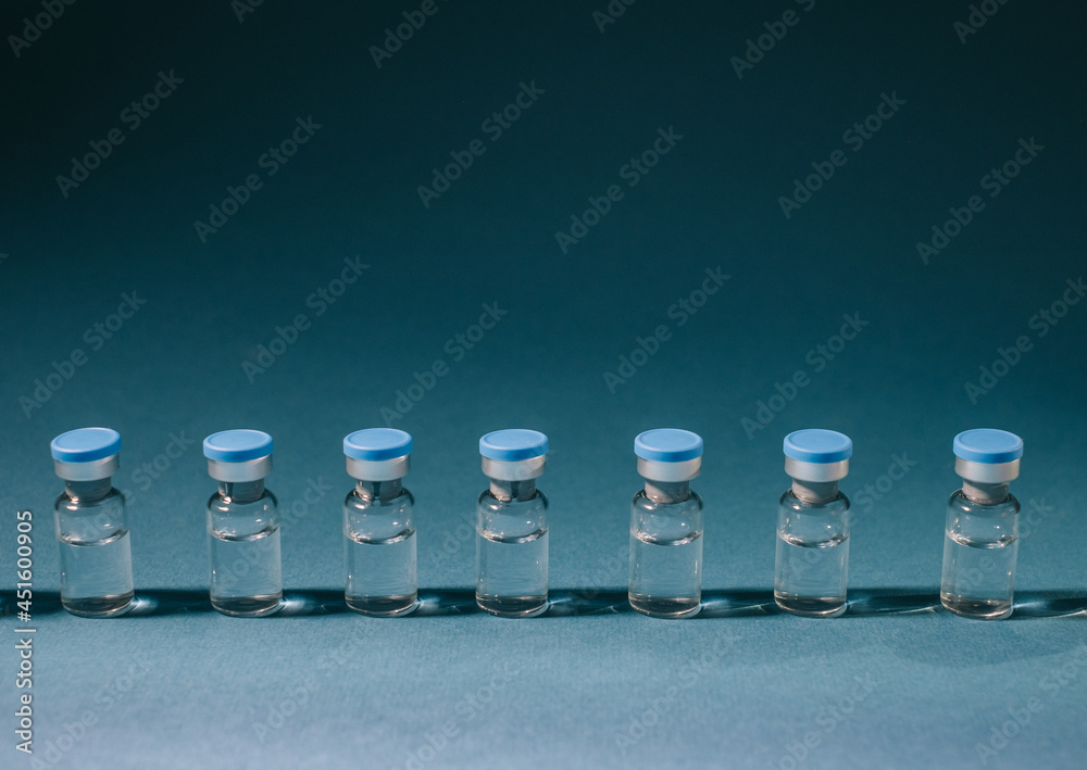 Row of medical ampoules for vaccination or treatment on a blue background.