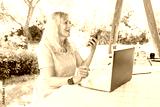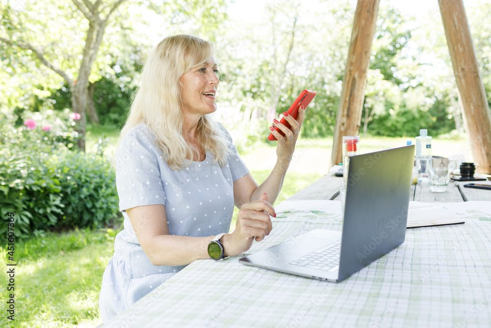 Smiling mature woman having video call meet computer in the home garden office. Online teacher meeting video conference calling. Attractive Businesswoman Telework. Education video conferencing.