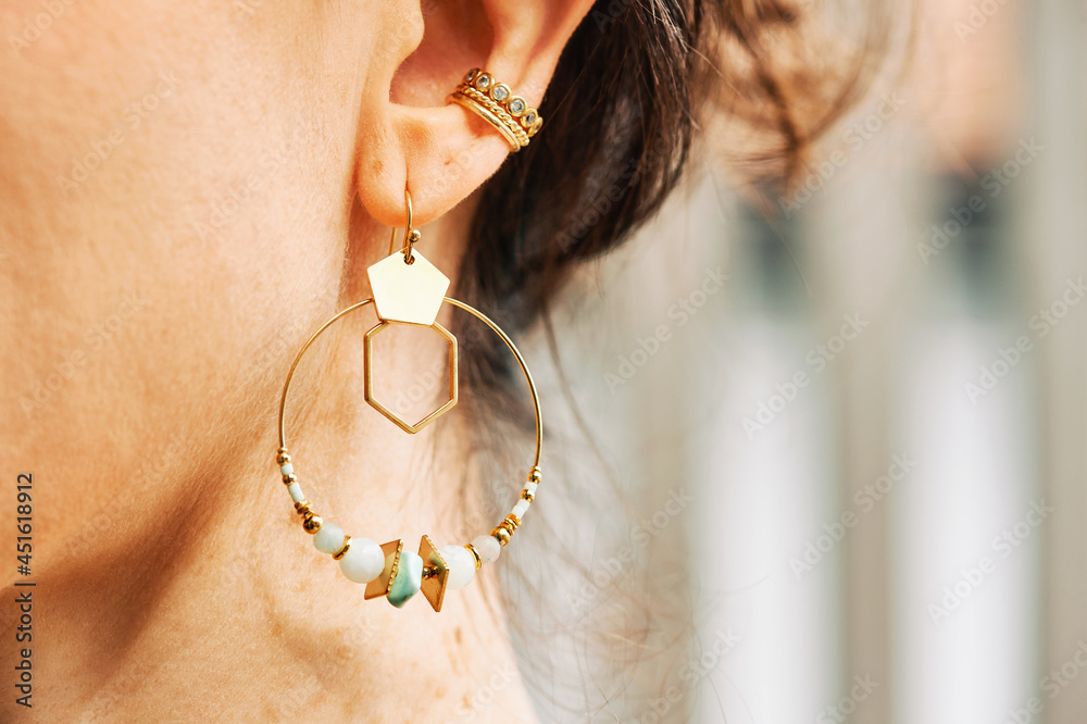Close up image of female ear wearing modern earring
