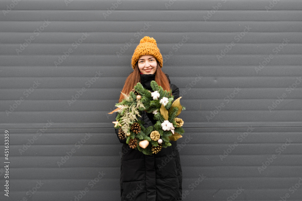 Young woman with Christmas wreath on grey wall background. Copy space Christmas banner. Handmade eco decoration for winter holidays