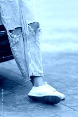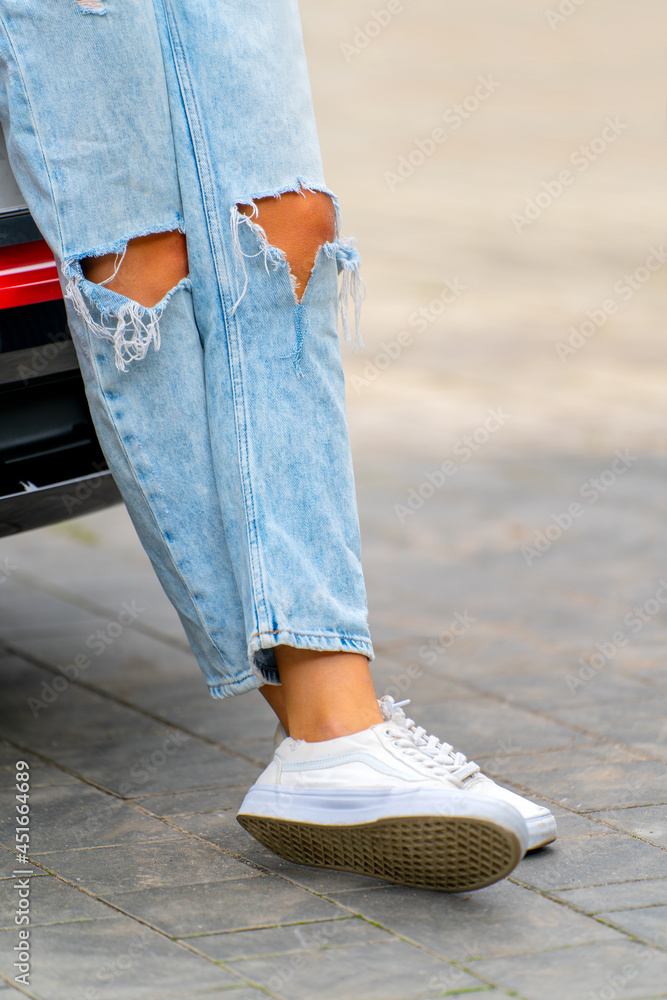 Red car and a girl in blue jeans. Modern trendy youth style.