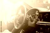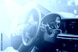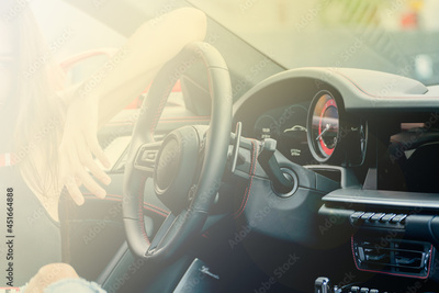 The girl is sitting behind the wheel of a car. Black leather interior of a modern car.