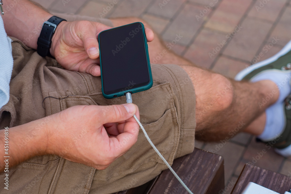 Man charges a smartphone with a power bank in hand. Portable charger for charging gadgets.