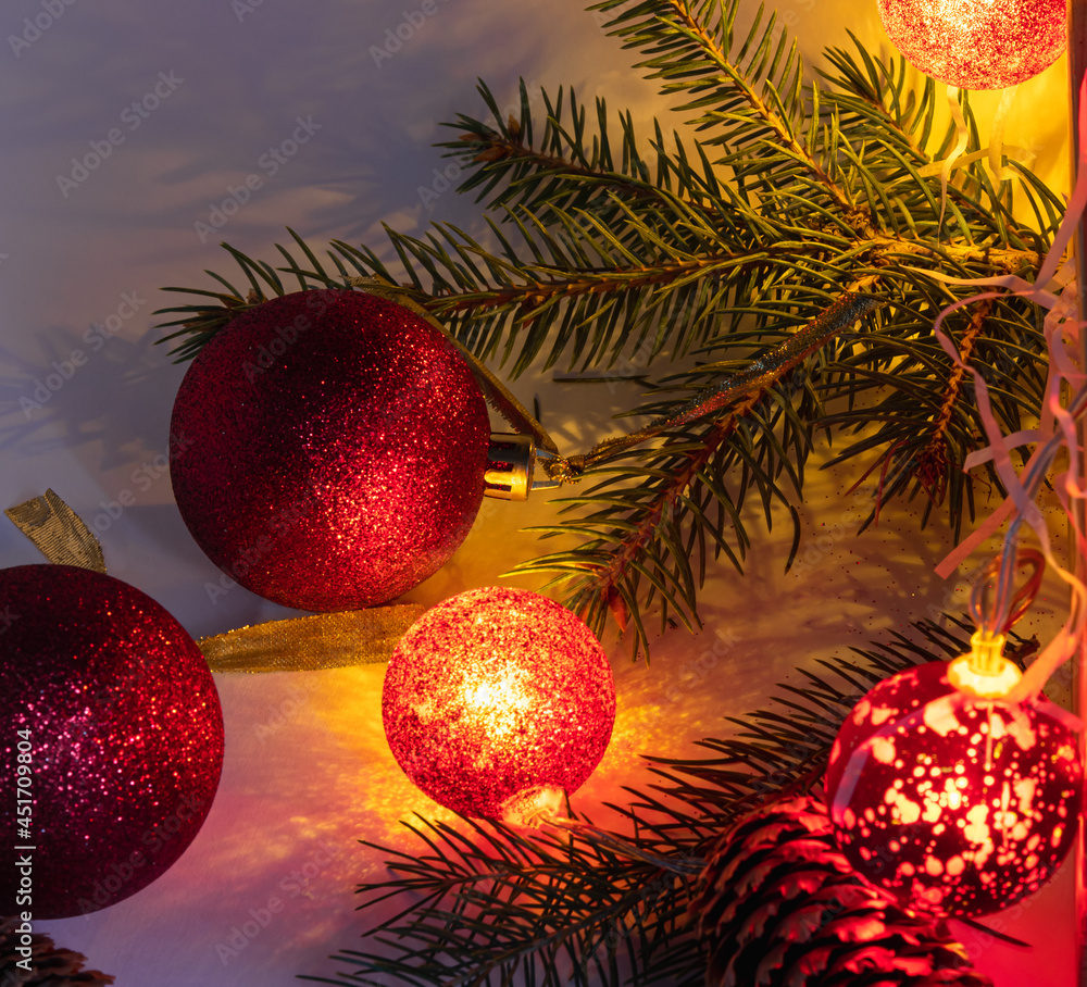 Glowing red christmas garlands with christmas tree branch and pine cones on the table. Festive decoration of winter holidays.