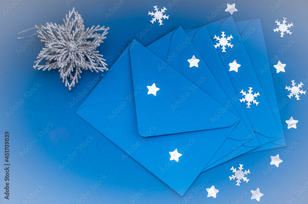 Concept Winter pattern made from small snowflakes and blue envelopes on pastel blue background. Copy space. Minimalism.