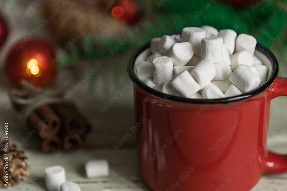 Red mug with cocoa and marshmallows on a background with a spruce branch and a garland. Selective focus, blurred background. close-up.