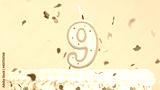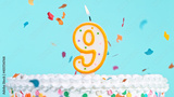 Colorful tasty birthday cake with candles shaped like the number 9. Pastel blue background.