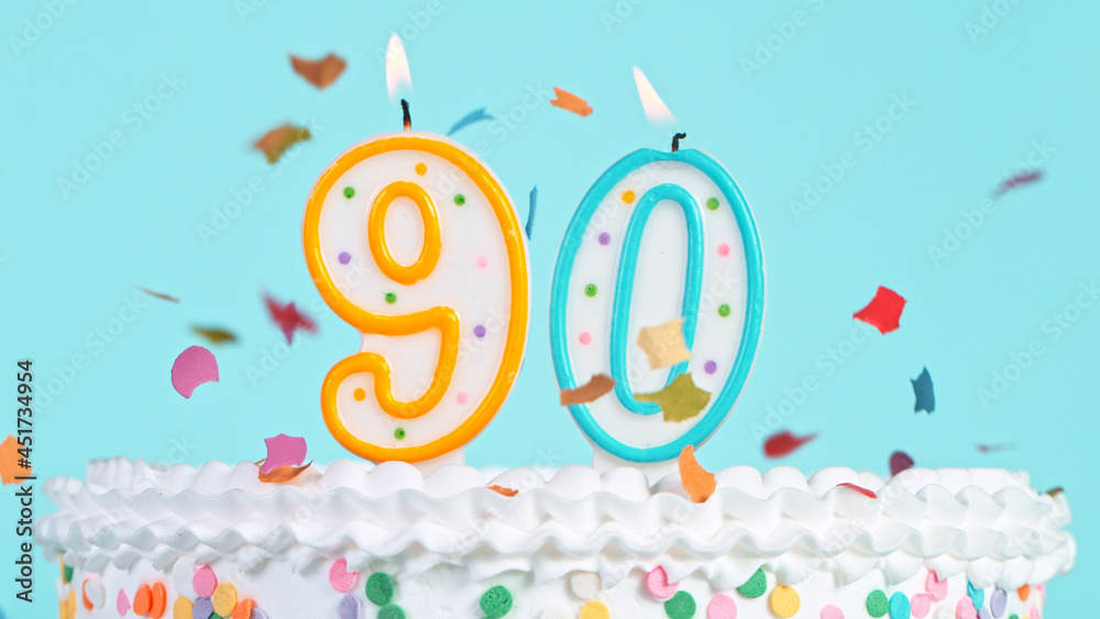 Colorful tasty birthday cake with candles shaped like the number 90. Pastel blue background.