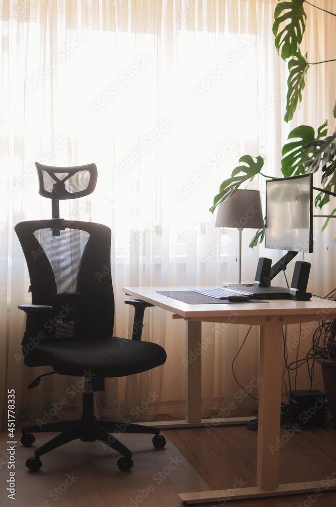 Orthopaedic chair for work at home. Minimalism home office interior with plants