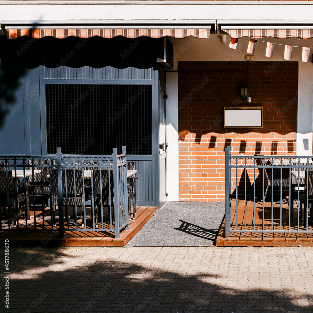 closed German restaurant with little flags, wooden entrance and abandoned terrace.