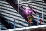 Wedler causing sparks on a commercial building metal roof with I beams showing