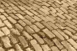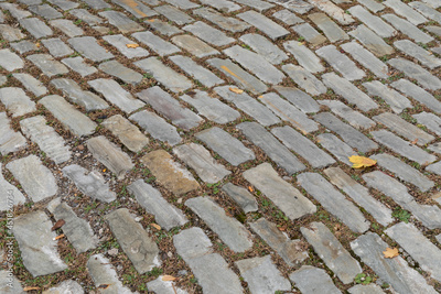 Street paved with gray stone blocks, grass and debris in the margins, horizontal aspect