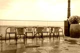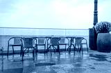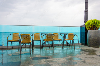 Tables and chairs after the rain near the sea.