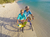 Happy senior couple exercising with bicycles on the beach on a sunny day