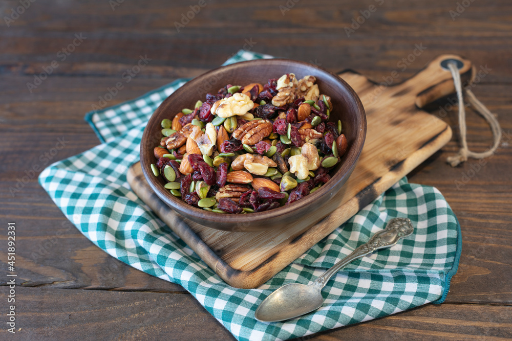 dried fruits on the wooden bawl, cranberries, walnuts, pumpkin seeds and almond