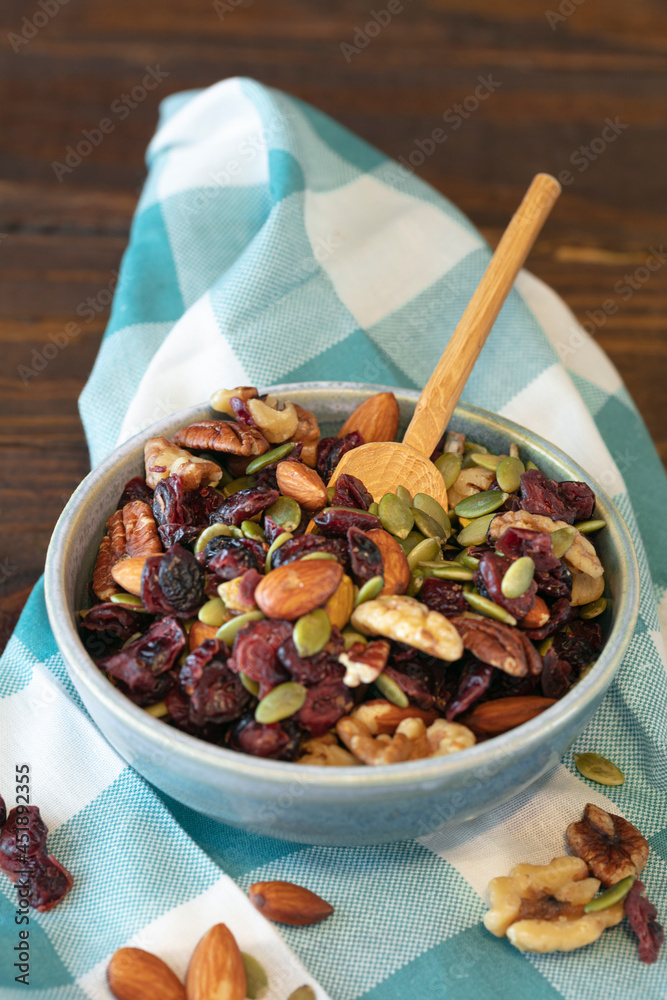 dried fruits on the ceramic bowl, cranberries, walnuts, pumpkin seeds and almond