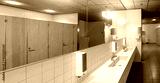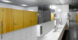 Interior of a public restroom with sinks, faucets and toilet cubicles