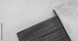 close up interior mood and tone board containing walnut wooden veneer or laminated, grey artificial stone or quartz placed on white stucco concrete background. interior material samples board.