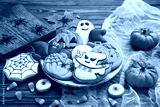 Halloween gingerbread cookies with candies and spiders on brown wooden table