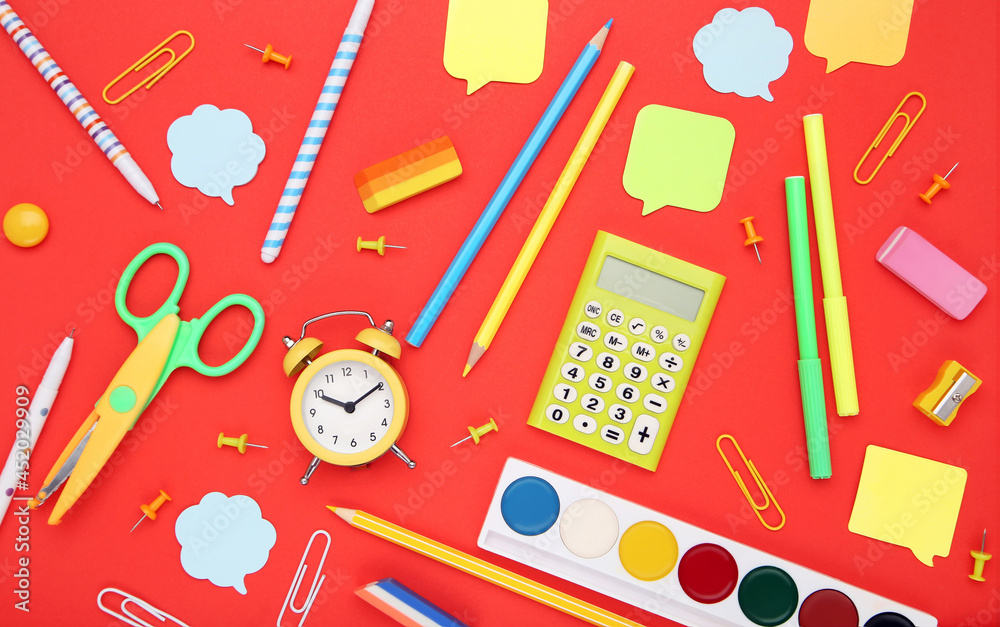 School supplies on red background