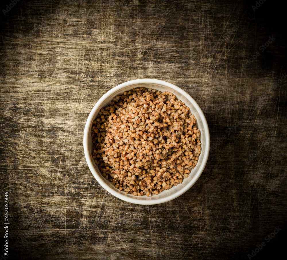 Buckwheat porridge in a white plate placed on a dark wooden background, close up