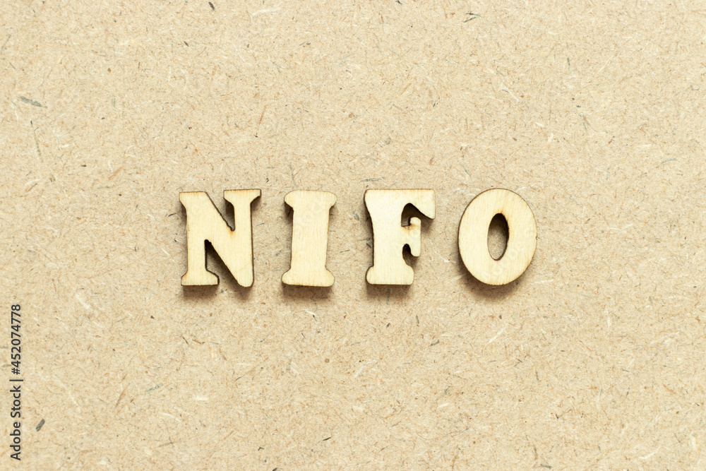 Alphabet letter in word NIFO (abbreviation of next in first out) on wood background