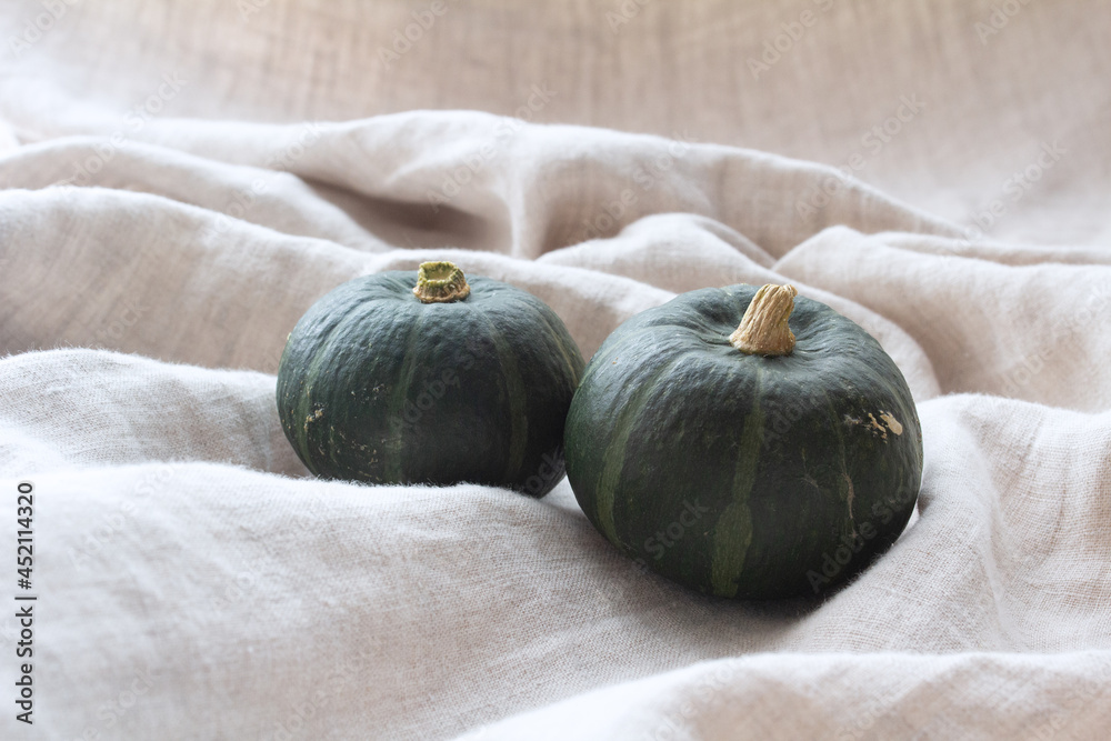 室内での麻の布と2つの小さい坊ちゃんかぼちゃ