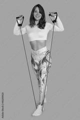 Fitness trainer shows exercises. A beautiful sports girl is engaged with rubber expander. Smiling fitness model in sportswear on yellow background. Advertising for the sports hall. Healthy lifestyle