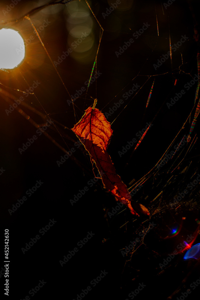 Orange maple leaf wrapped in spiders web during morning sunrise