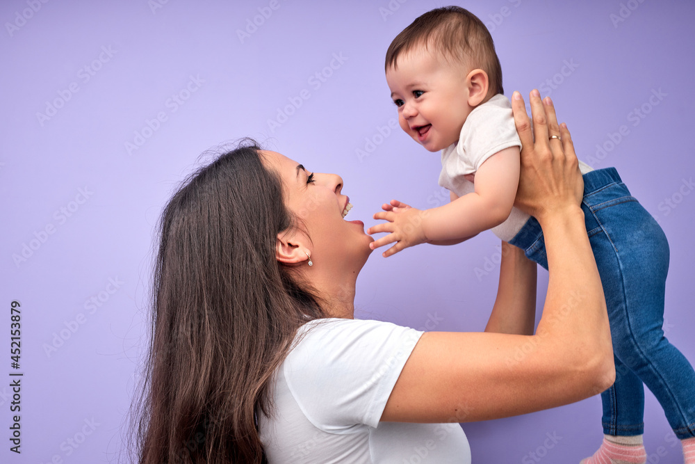 Beautiful young caucasian mother tossing up child baby. Baby laughing. Purple background. In studio. Copy space, side view. Portrait of caucasian family. Happy childhood concept
