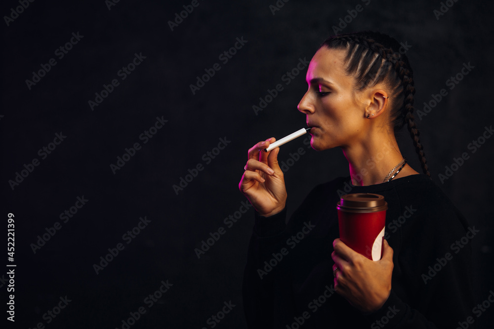 Beautiful young woman in black background with backlight smokes electronic cigarette