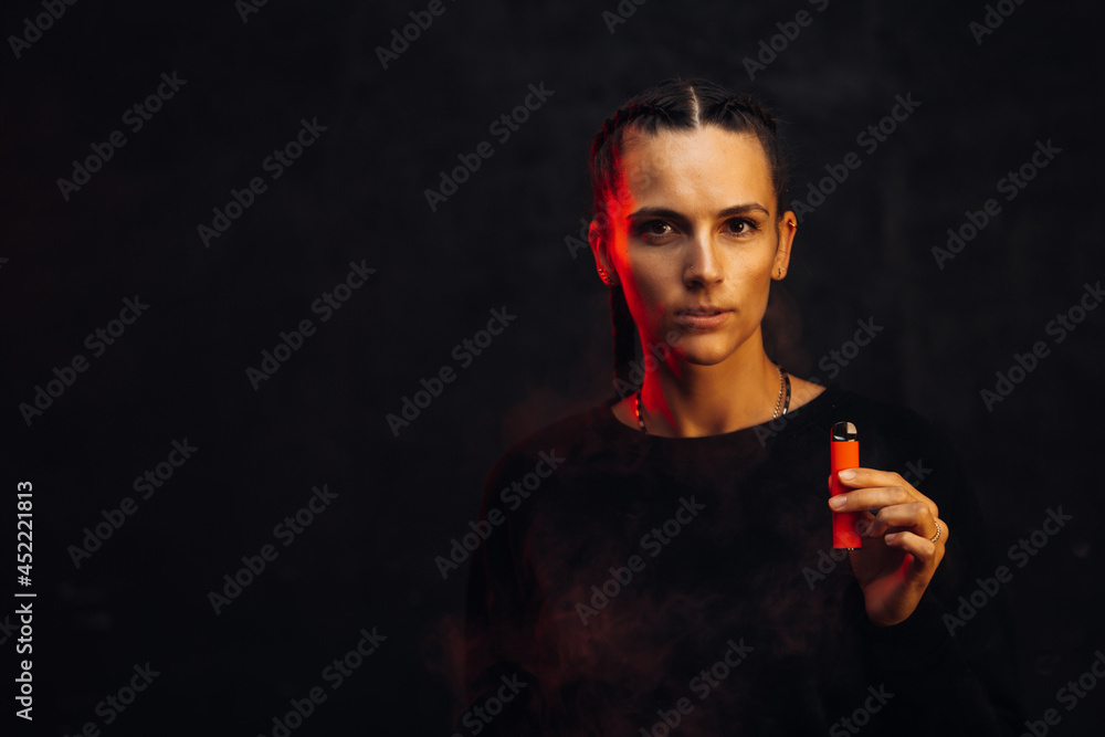 Beautiful young woman in black background with backlight smokes electronic cigarette