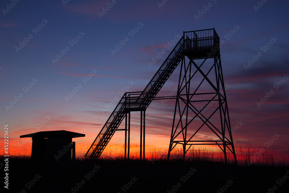 A wide shot of an elevated outdoor staircase and viewing platform at sunset with a dramatic blue and orange sky